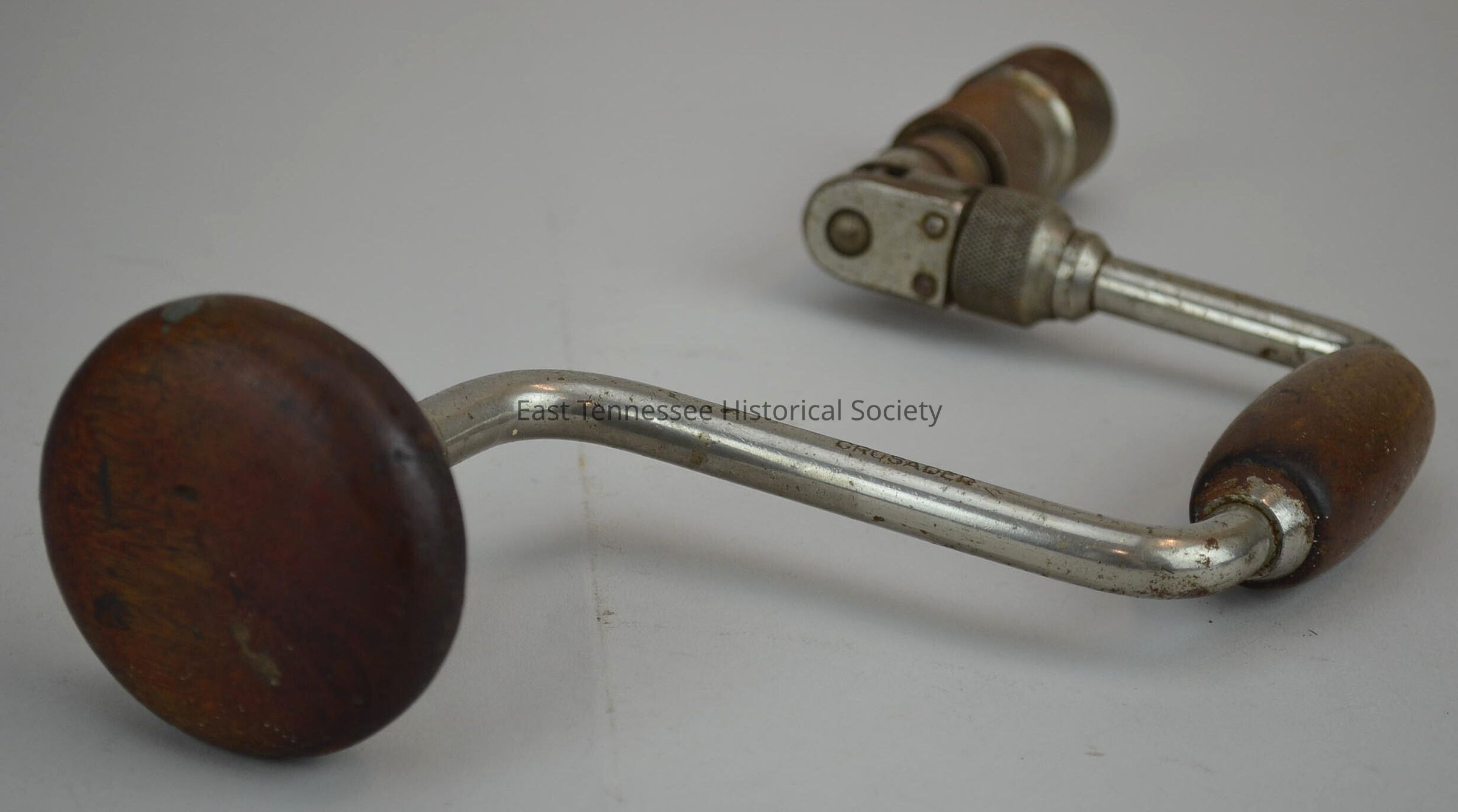 Brace, chromed metal with wood knob and grip and metal mounts, cross-hatch design on metal adjusters, top one with ratchet feature to turn bit without completely turning brace. marked "Crusader" (company name of seller)/probably manufactured by Stanley, 13 3/4"h x 8"w, 1890s-1920s. Knox and bit assemby turn.