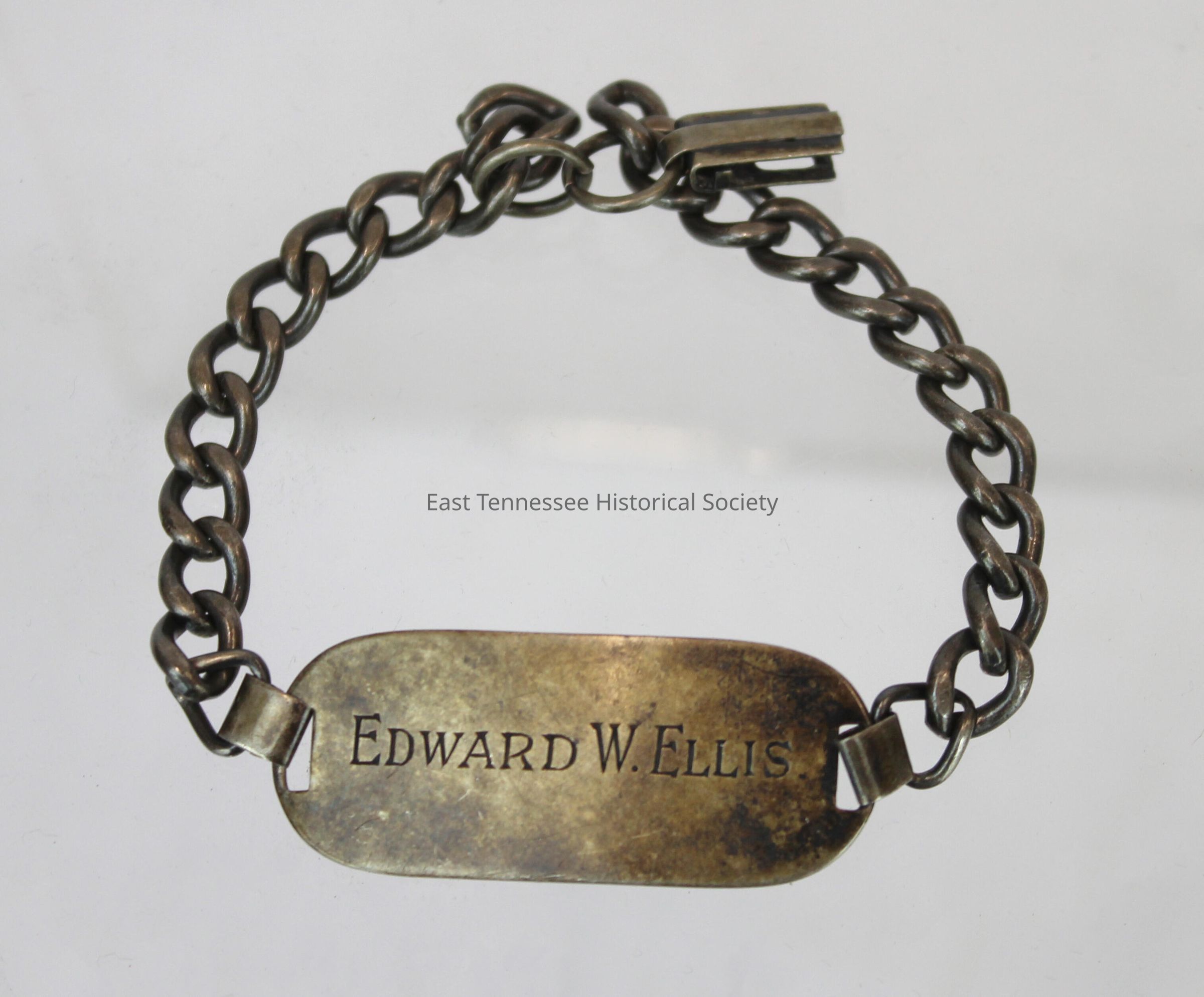 Identification bracelet of Edward Ellis, metal flatend-link wrist chain with rectangular plate with rounded ends--obverse engraved "EDWARD W. ELLIS," reverse engraved "O-338597 [military service number], reverse stamped "STERLING," chain ends joined by "O" ring, 1/2 clasp attached, 5/8"h x 1 9/16"w x 1/32"d, without manufacturer's name, 1945-1949.Made/Created