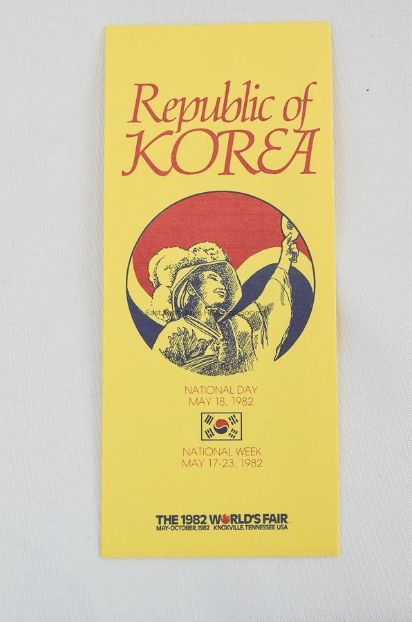 Yellow brochure reading in red font, "Republic of KOREA", "Worlds Fair" 1982 with illustration of woman in center of Korean flag circle wearing a hat and holding up a flame(?). Inside describes the official ceremony schedule.Dimensions