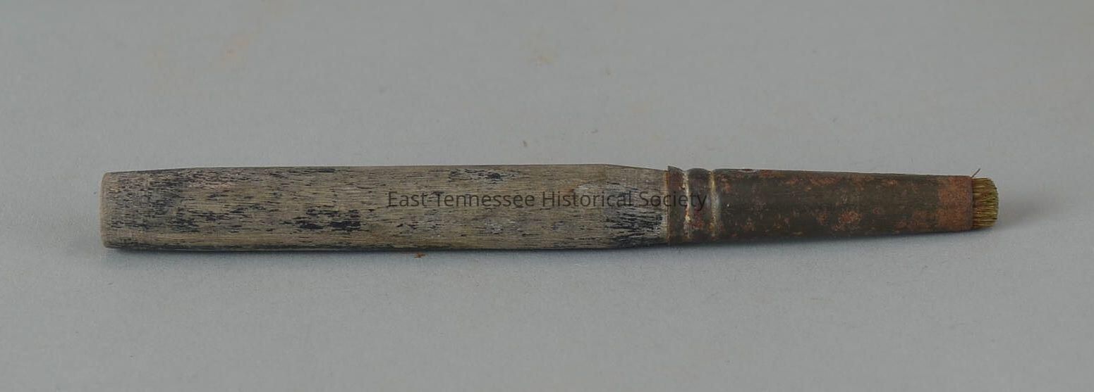 Brush used by Sara Young, black-stain cyllindrical wood handle with 1 3/4"w metal tip and 1/8"w hair brush on end, manufacturer unknown, 5 1/4"h x 1/2"w, date unknown (1951-?)Made/Created