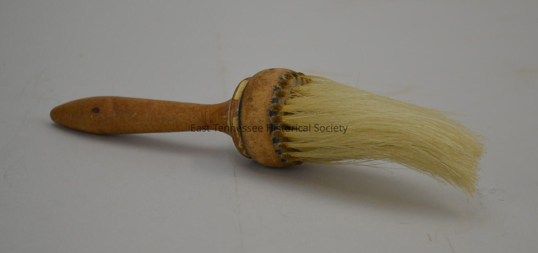 Barber neck duster brush used by Bruce H. Drinnen Sr. at Drinnen's Barber Shop, turned wood handle tapers to pointed end, attached head with natural-color bristles, thread in circle around head, remnants of black and cream color paint where handle joins head, manufacturer unknown, 9"h x 2" diam., 1929-1970s.Made/Created