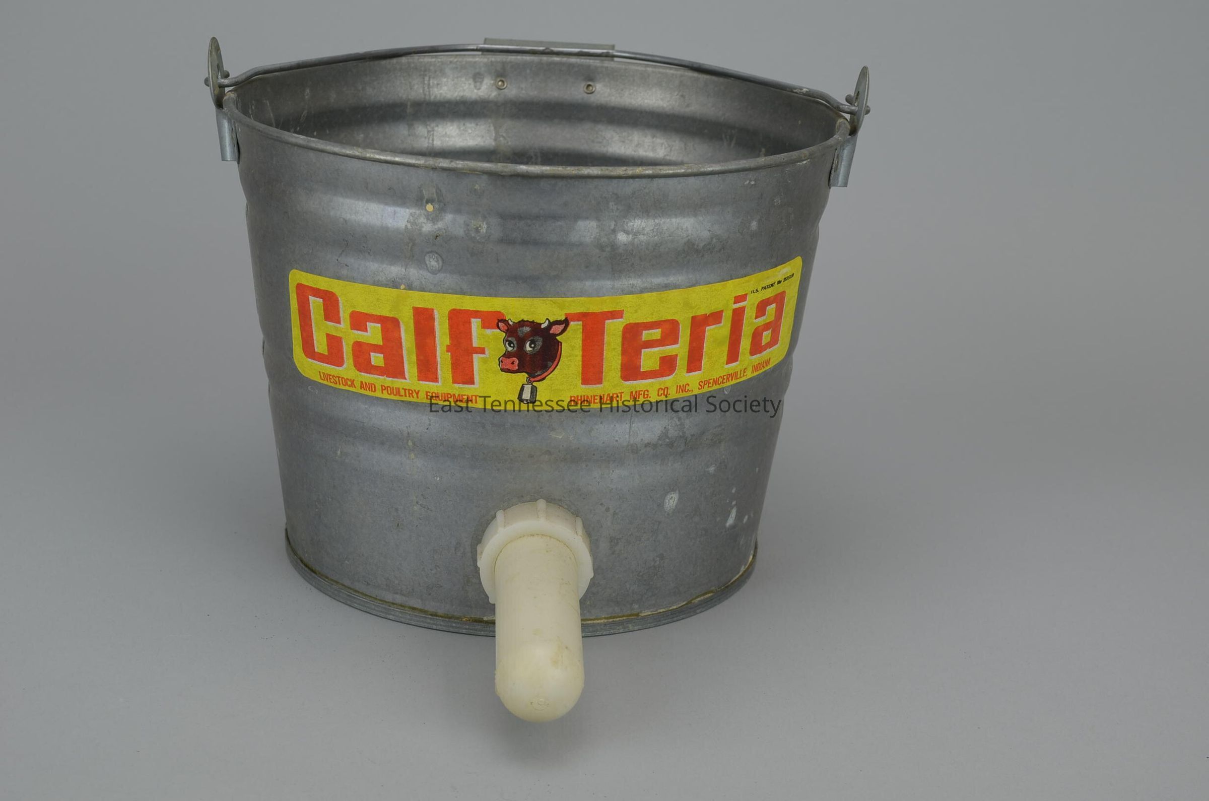 Milker bucket for feeding small calves*, galvanized metal with plastic nipple placed low on side, wire bale handle attached at opposite sides, yellow-and-red paper label at front and marked "Calf Teria Livestock & Poultry Equipment Coop," price sticker at back right and 7.75 marker at back left with tax added $7.88, manufactured by Rhinehart Mfg. Co. Inc. (Spencerville, IN), 13"h x 15" diam., date unknown/c. 1945-1965.