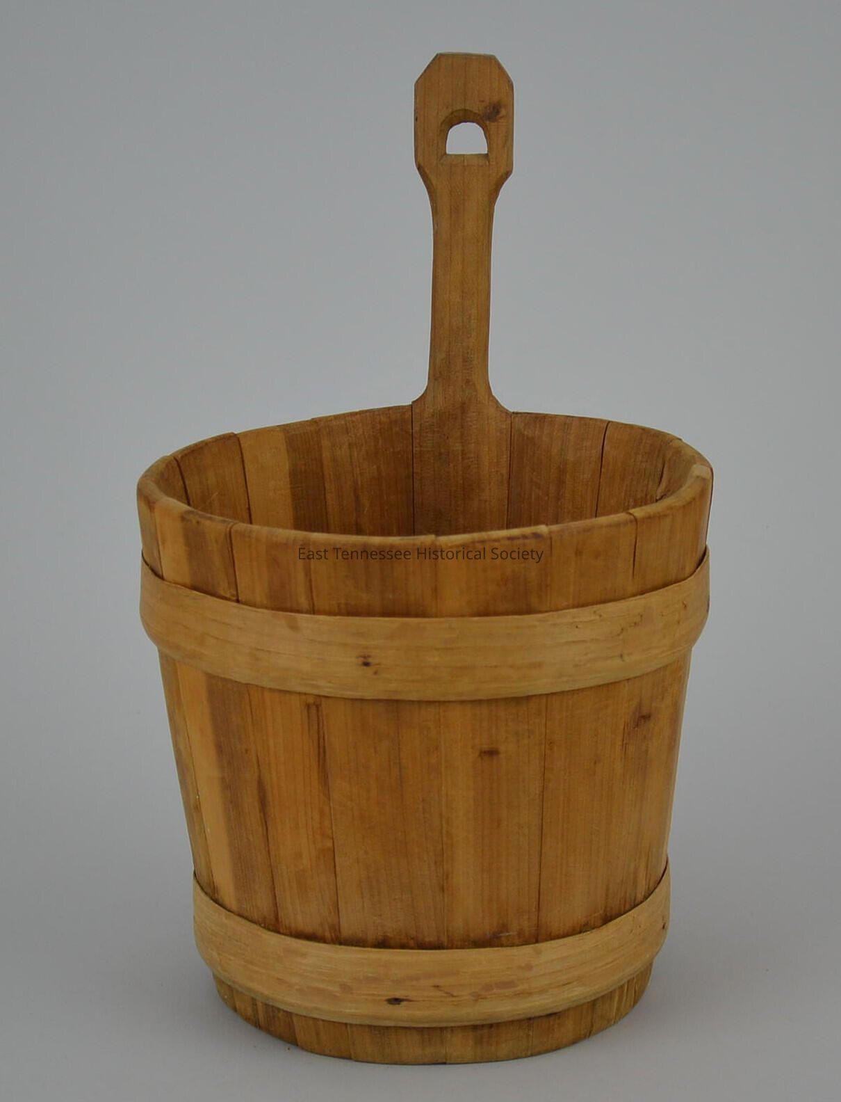 Piggin (small wall basket) made by Alex Stewart, all wood, 16 hand-cut slats held together with a wooden belt, soaked and bent to shape and fastened with hand-carved lap joint, one slat long and carved into handle with hole for hanging, solid base inset about 1" and signed and dated on bottom by maker "Alex Stewart 6-5-1978," constructed without nails/screws/metal fasteners, 14"h x 8 1/2" diam., June 5 1978.Made/Created
