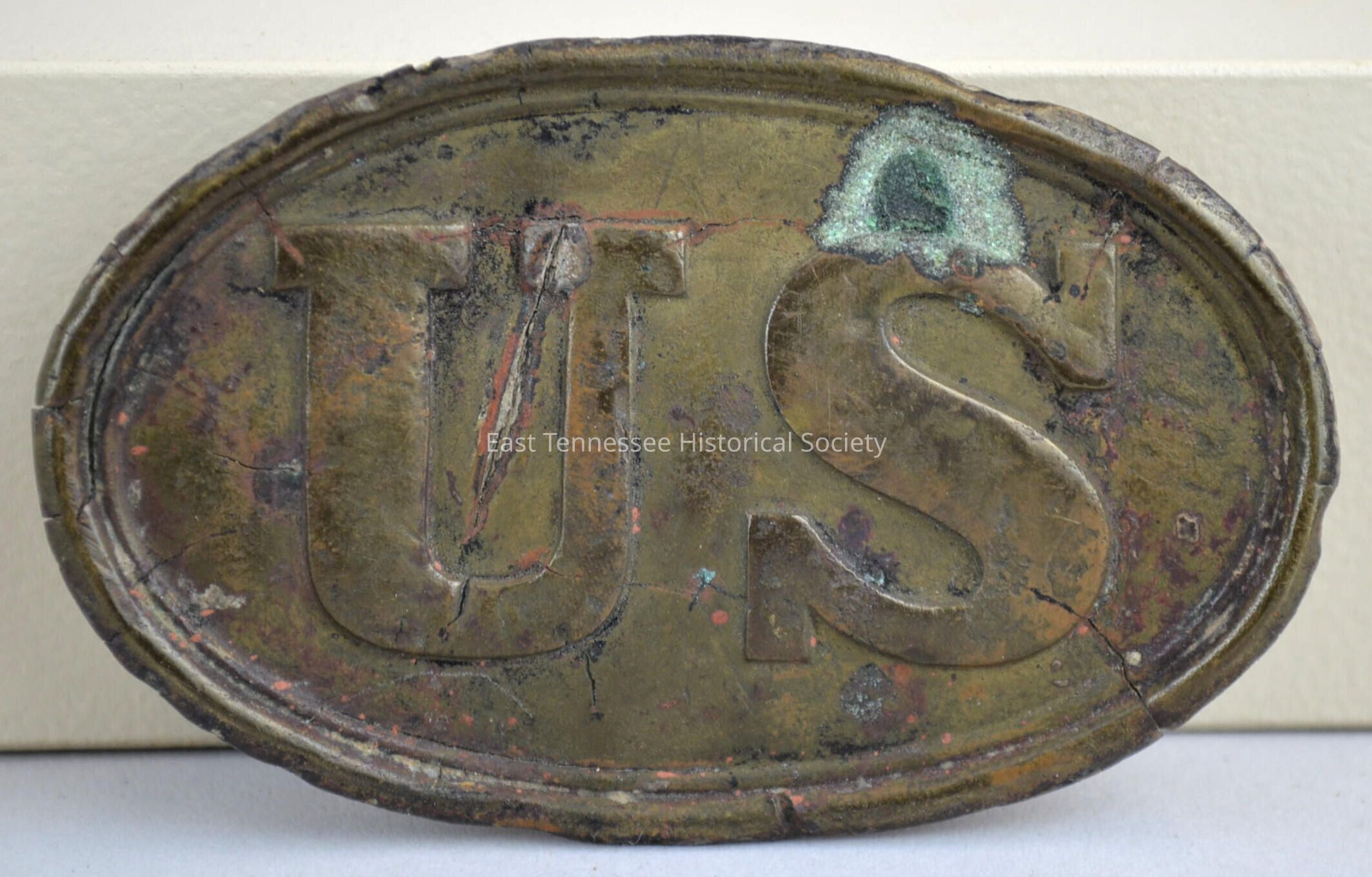 Excavated Union Army belt plate, oval brass disc with raised "U S" on obverse and two oval studs and one hook on reverse, 2 1/8"h x 3 3/8"w x 5/8"d, Civil War era/1861-1865.Dimensions