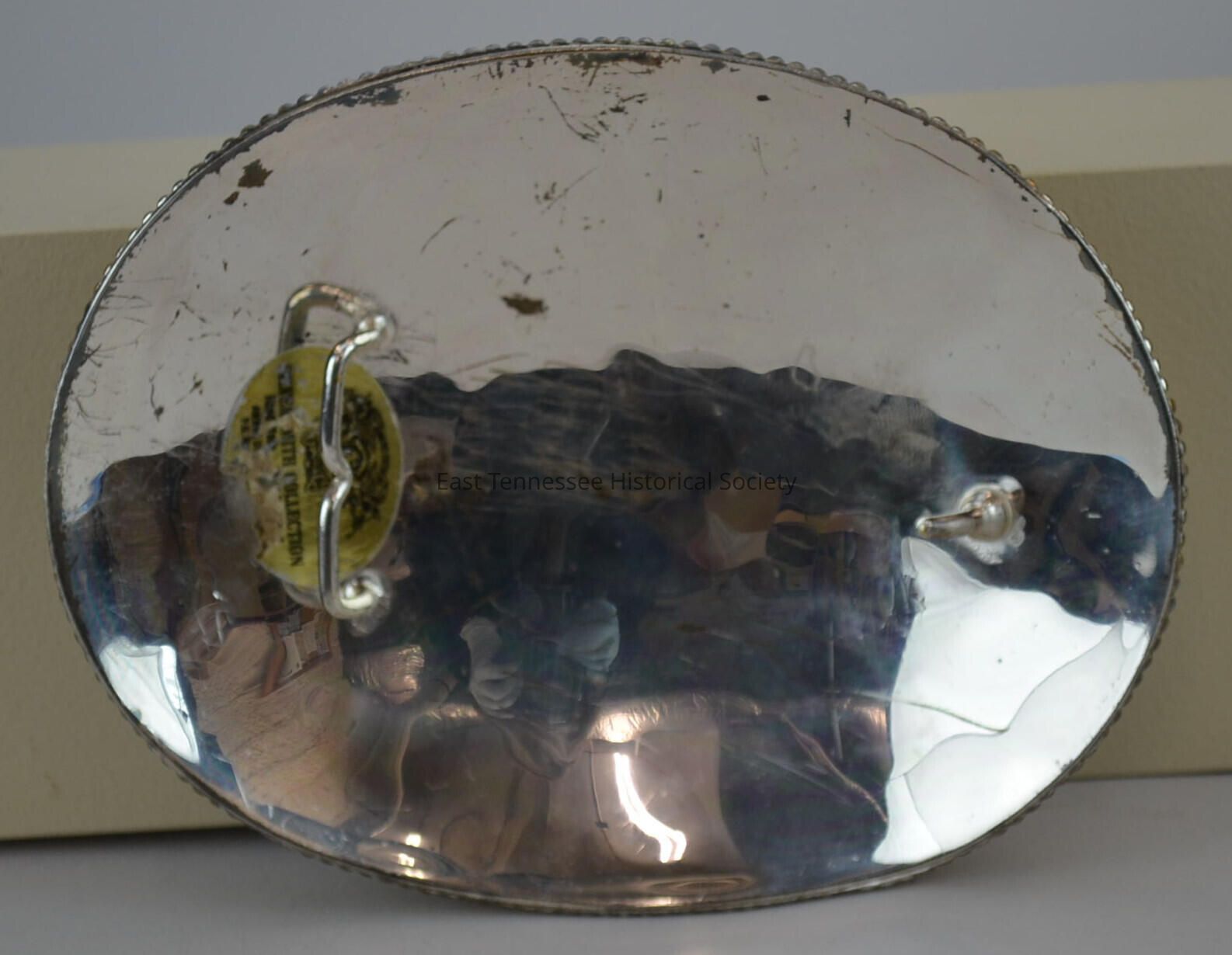 Man's belt buckle of Harley B. "Sunshine Slim" Sweet (believed used with his performance clothes), domed oval silver-and-gold tone metal, gold beaded edge, gold tone banners at top and bottom, silver tone pebble background with silver plumes around gold circle with stars and bull rider on bucking bull, partial label on reverse marked "Award Design Silver Smith Collection," loop for belt and curved pin for belt hole, 1 1/2"h x 6 3/4"w x 5 3/8"d, date unknown.Collection