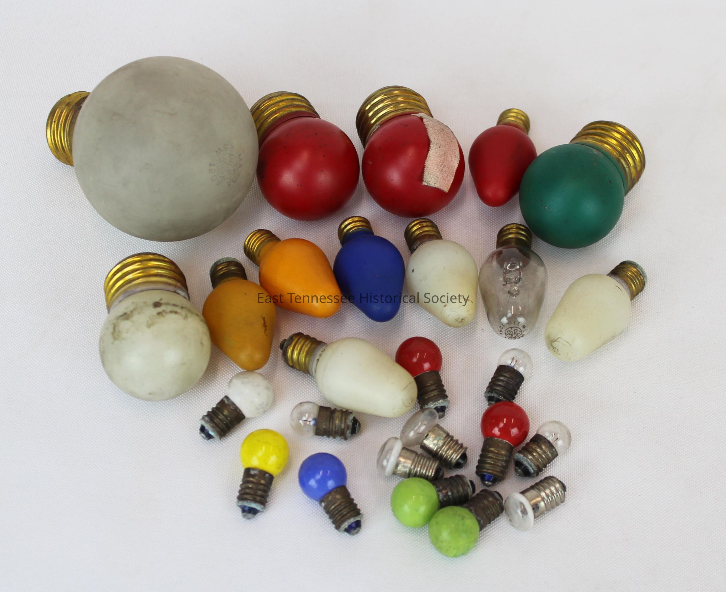 Bag of assorted size and color light bulbs for use with miniature theater 2011.1.1; one large/four medium/eight small, smaller bag with smaller bulbs of various size and color (seven colored, six clear), assorted manufacturers, c. 1935?