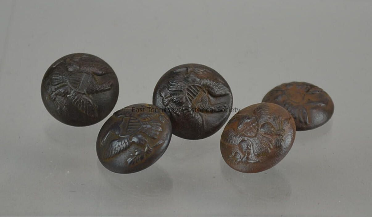 Buttons (5) from Union Army uniform, United States seal on front, reverse marked "SCOVILL MFG & CO. / WATERBURY," manufactured by Scovill Mfg. & Co. (Waterbury. Conn.), Civil War era/1861-1865.Made/Created