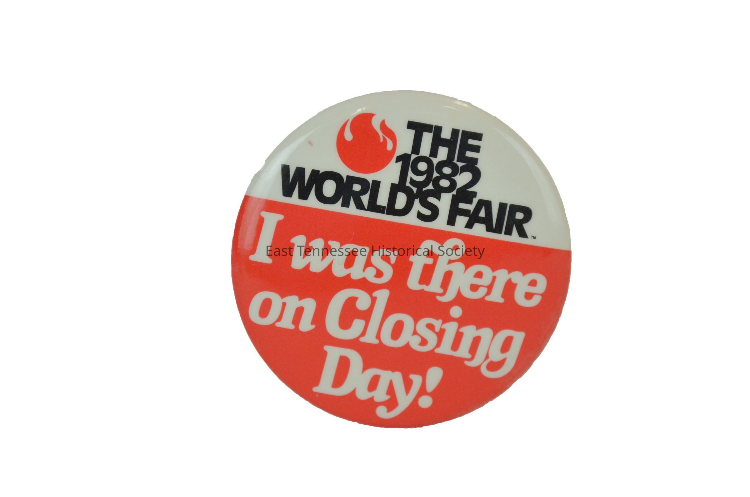 Top portion of button is white. In block lettering, it reads "The 1982 Worlds Fair," with the fair logo (flame) in orange. The bottom portion of the button is orange with white lettering and reads "I was there on Closing Day!"Collection