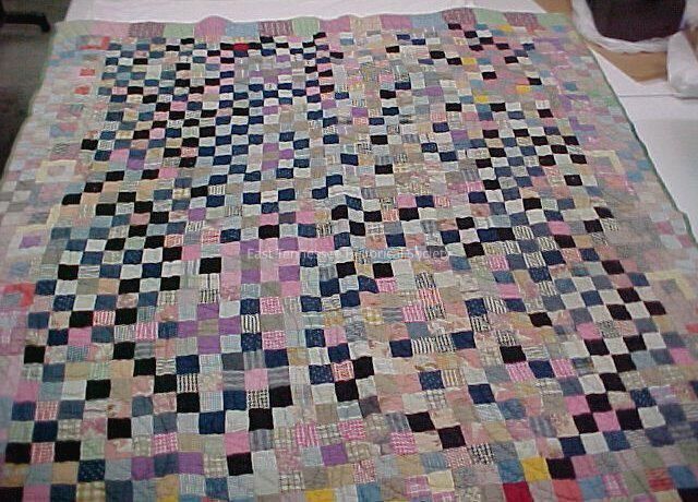 Quilt of/made by(?) Pollyanna Creekmore's maternal aunt* [either Mrs. Mary E (GL) Perkins or Mrs. Nancy (JH) Duncan], variety of cotton fabrics including pink/blue/green/yellow prints and solids, 1 1/2" squares with log cabin variation along sides and border of multi-patch, pale green backing, hand-quilted in fan pattern, c 1920s (fabrics in the quilt top date to 1910s-1920s although green in the backing could be from the 1930s).