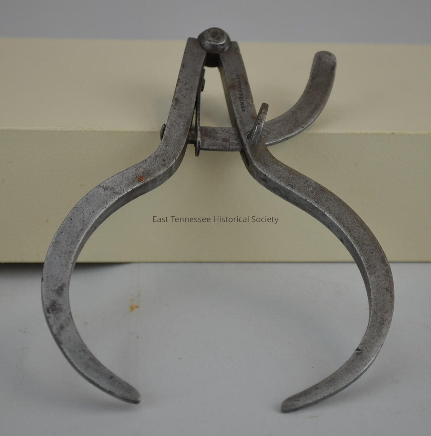 Outside calipers, metal, turn screw on arc regulates width of two hinged legs with in-turned points, marked "BEMIS & CALL CO." on top bar, 6"h x 4 1/4"w, 1880s-1910s