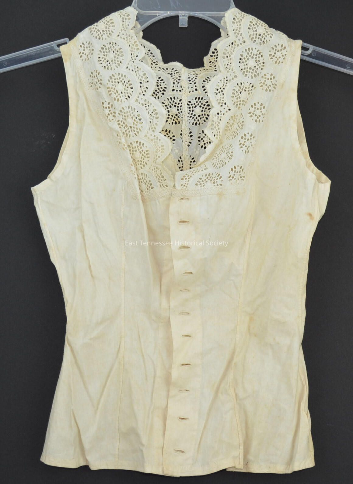 Camisole, cotton/originally white now tan, scalloped eyelet lace front and reverse yokes, eleven-button front opening with handmade buttonholes, fitted, princess seams, hand and machine sewn/maker unknown, 20 1/2"h x 14"w at hem/11 1/2"w at shoulder, mid-19th century?Dimensions
