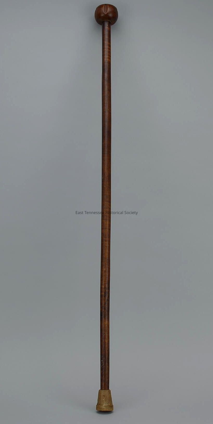 Walking stick of James Elijah Brown, dark-brown wood, 1 1/4" round knob handle with four evenly spaced vertical indentations on side (to aid gripping), tan-colored rubber tip over end, 36 7/8"h x 2 1/4" diam. at handle end and 1" diam. at tip, early 20th century.Made/Created