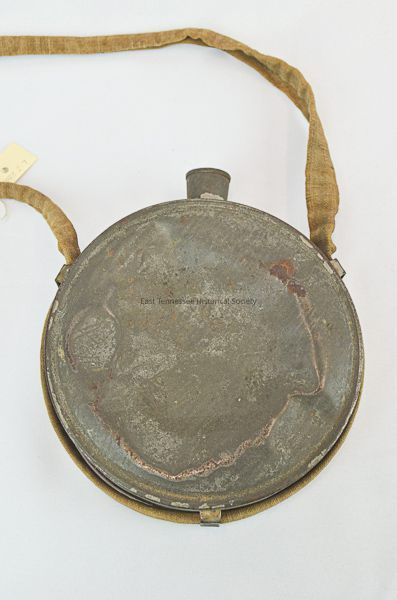Confederate States of America. Army circular tin canteen with 3 strap lugs, pourign spout and canvas strap; flat on inside, bulging on outside front; from Civil War, 1861.Dimensions