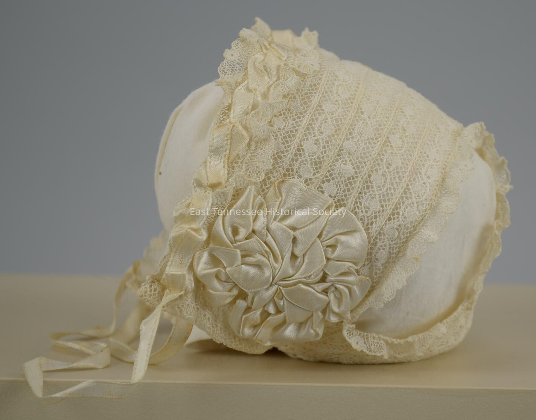 Baby cap of Hazel Leone Kinsland, white lace joined in rows, trimmed with ruffled lace, bottom band with flat lace, braided satin ribbon trim around face with same ribbon used as tie, satin ribbon rossettes at each side, serarrate piece of joined flat lace at back of cap, trimmed with lace ruffle, joined at crown and lower back sides, unknown maker/handmade, 5"h x 5"w x 5"d, c. 1893.Made/Created