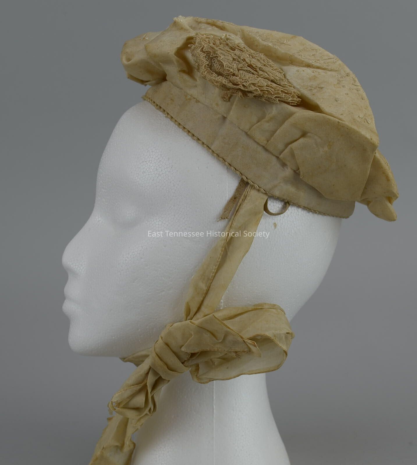 Tam of Hazel Kinsland, cream silk with hand embroidery, pleated onto stiffened circle trimmed with braid, hat band also faced with buckram with braid trim, 3"w self fabric ties,elastic tacked to same place, left side trimmed with lace rosette, unknown maker/handmade, 5 1/2"h x 9 1/2"w, c. 1900.Made/Created