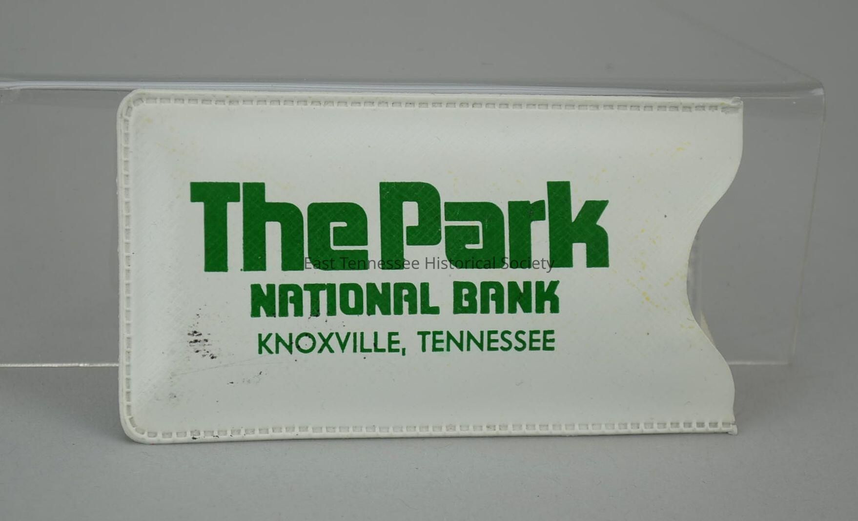 a) White plastic open-end pouch with "The Park National Bank Knoxville, Tennessee" printed in green on front, 1 1/8"l x 3 3/4"l.