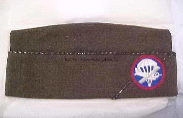 Garrison/overseas cap worn by Burgin E. Dossett, 2nd Lt. Balloon Corps, with glider/parachute patch, WWI/c. 1918.