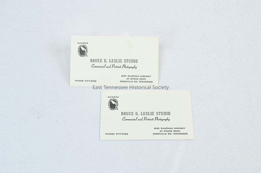 Business cards for Bruce G. Leslie's photography studio, BRUCE G. LESLIE STUDIO / Commercial and Portrait Photography/ PHONE:577-0106/ 5101 CHAPMAN HIGHWAY/ AT STONE ROAD/ KNOXVILLE 20, TENNESSEE”Collection