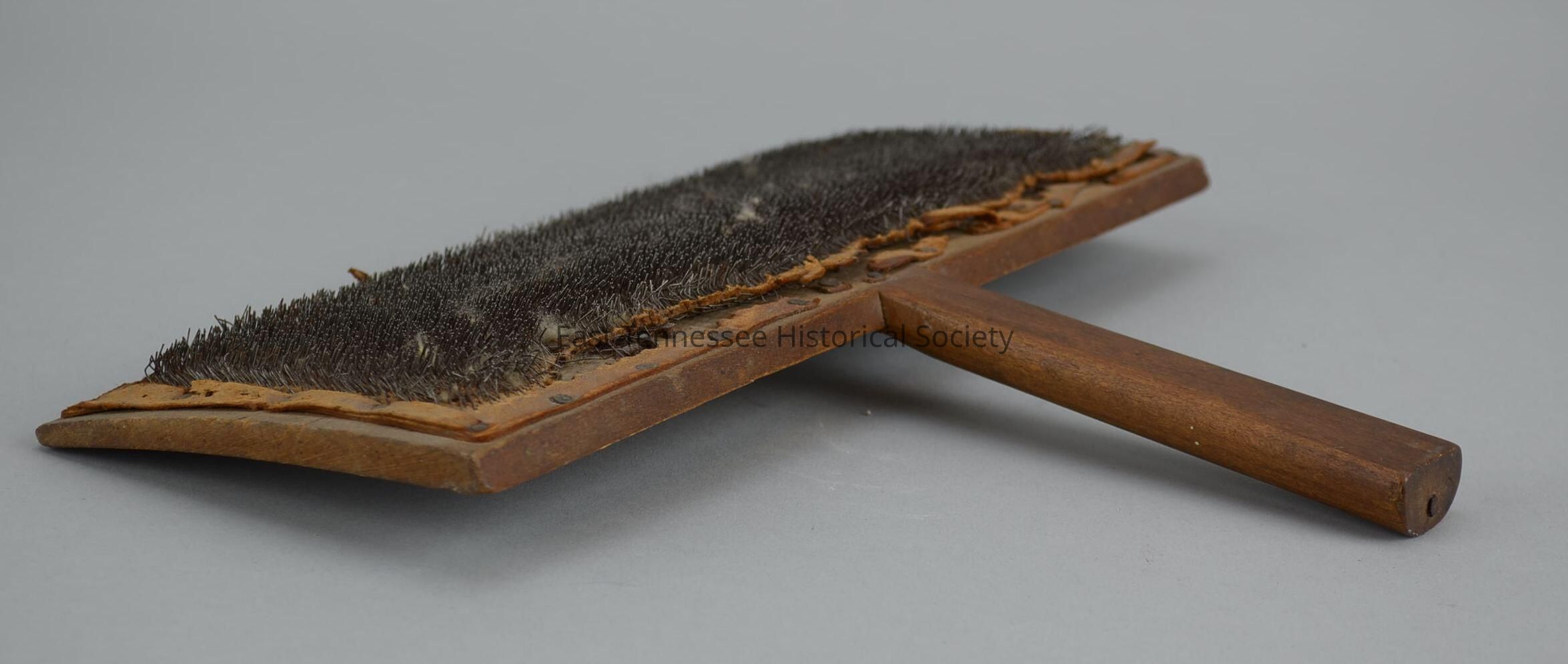 Pair of wool cards from Brookside Farm, wood rectangle with inset titled handle fastened with two nails, logo stamped in ink semi-circle, marked [partly legible] "No. 10 Super Fine" [clear], piece of leather on reverse imbedded with thousands of staples with sharp side out and tacked all around to wood, wool fibers remain in staples, Whitmore (England), both 9 1/8"h x 10 7/8"w x 3/4"d, date unknown.Made/Created