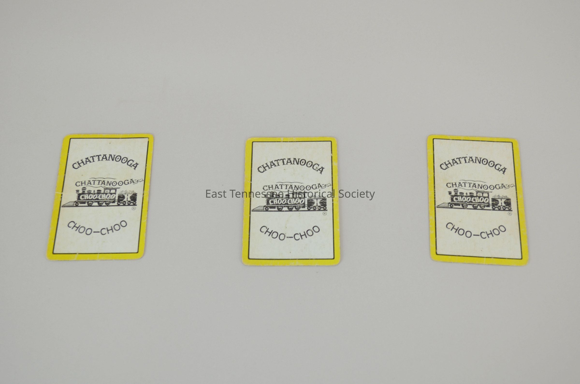 Three playing cards from a deck with no box, souvenir cards feature the Chattanooga Choo-Choo with a curved "CHATTANOOGA" printed above the logo and "CHOO-CHOO" printed curved below the logo, cards are white and printed in black with a 1/16" bright yellow border and a think black border inset around the yellow, 3 1/2"h x 2 1/8"w, possibly 1960s.