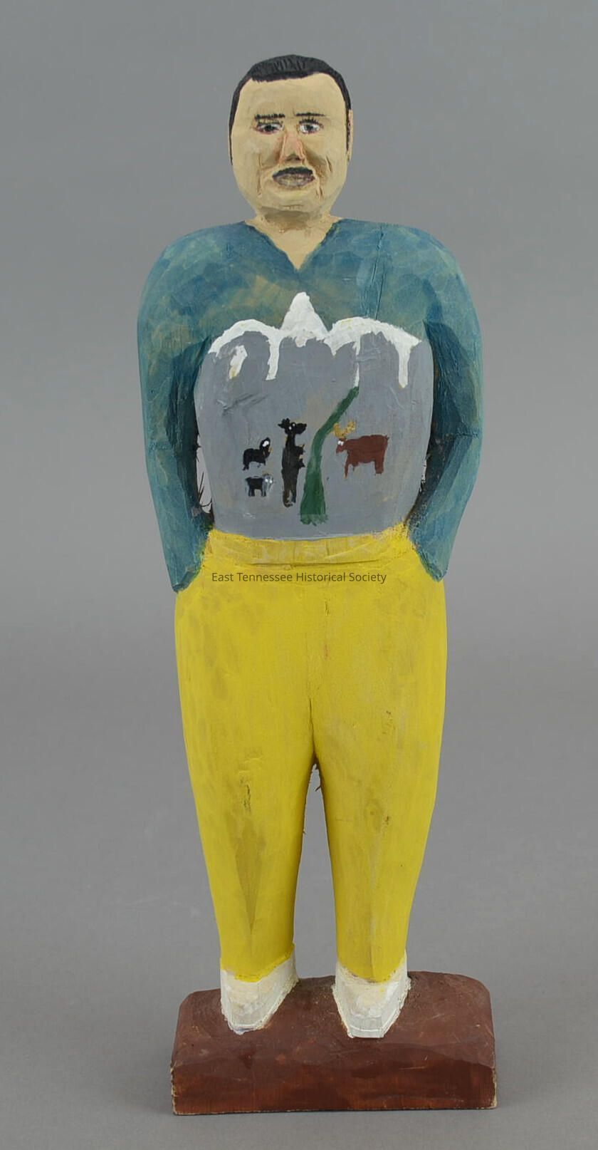 Hand carving of Phil Campbell (son of Archie Campbell) by Bill Frazier, primitively sculpted wood, depicts man with hands in pants pockets wearing blue sweater with mountain-and-animal design on front and reverse and yellow pants, base marked "Phil CAMPBELL / 1996 By/ Bill FRAZIER" in black ballpoint pen, 12"h x 4"w x 2"d, 1996.Collection