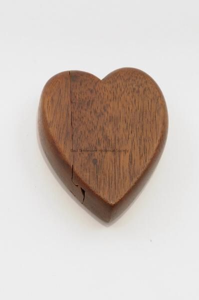 Hand-carved wooden heart with sliding side that reveals interior carved snake, made by unidentified East Tennessee Confederate prisoner of war/POW, 1861-1865.Made/Created