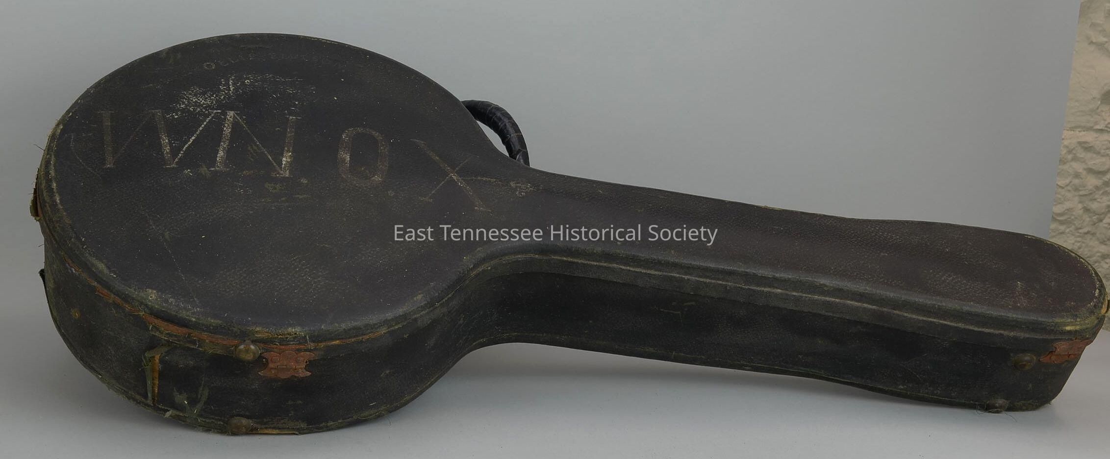 Original hard-shell case, heavy cardboard with metal edges covered in black leather-looking cloth, three hasp locks and one keyed lock (key missing), exterior lid marked "Ollie Ellison WNOX," purple flannel lining with padding, manufactured by Gibson(?), 36 1/2"h x 15 1/2"w x 6"d.Made/Created