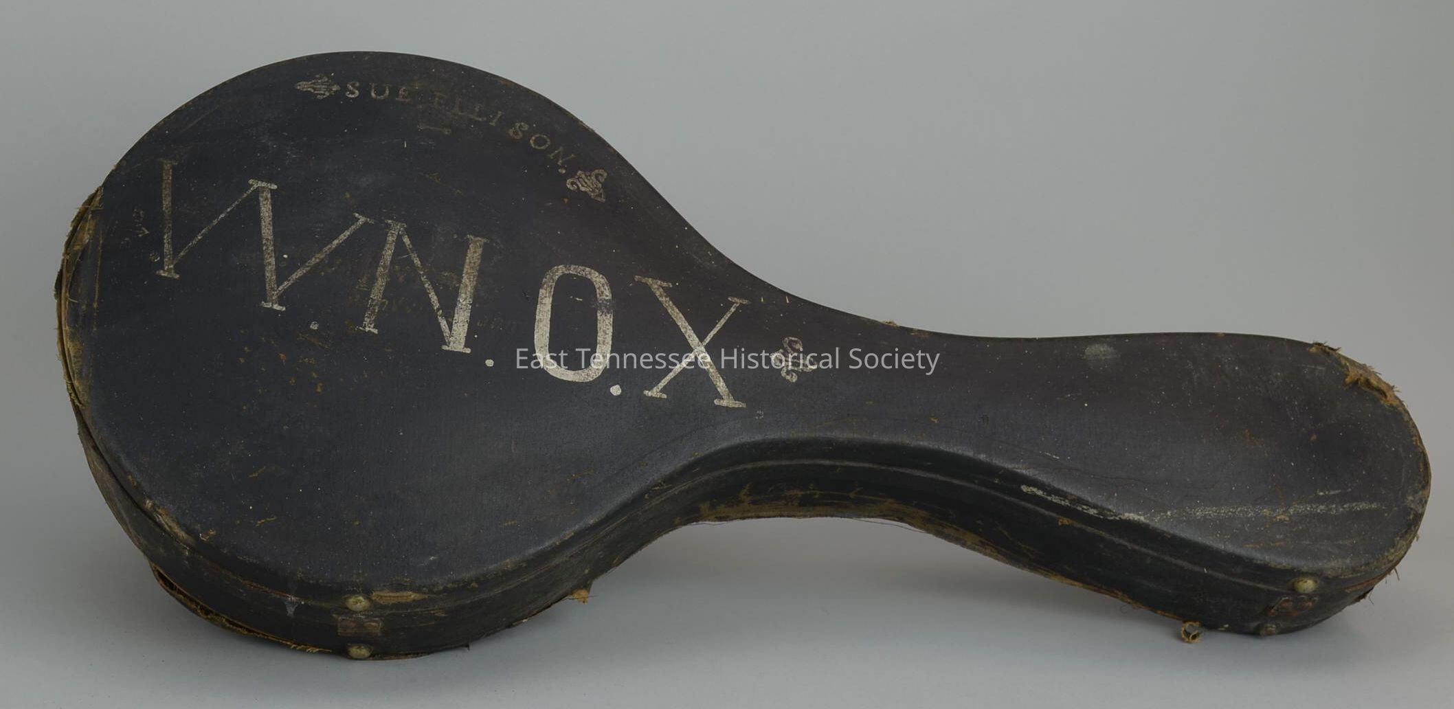Original hard-shell case, heavy cardboard, metal rims covered with leather-like cloth, exterior lid marked "Sue Ellison / WNOX" in silver paint, two hasp locks and one keyed lock (key missing), purple flannel lining, manufactured by Gibson(?), 27"h x 12"w x 4"d, 1927.Made/Created