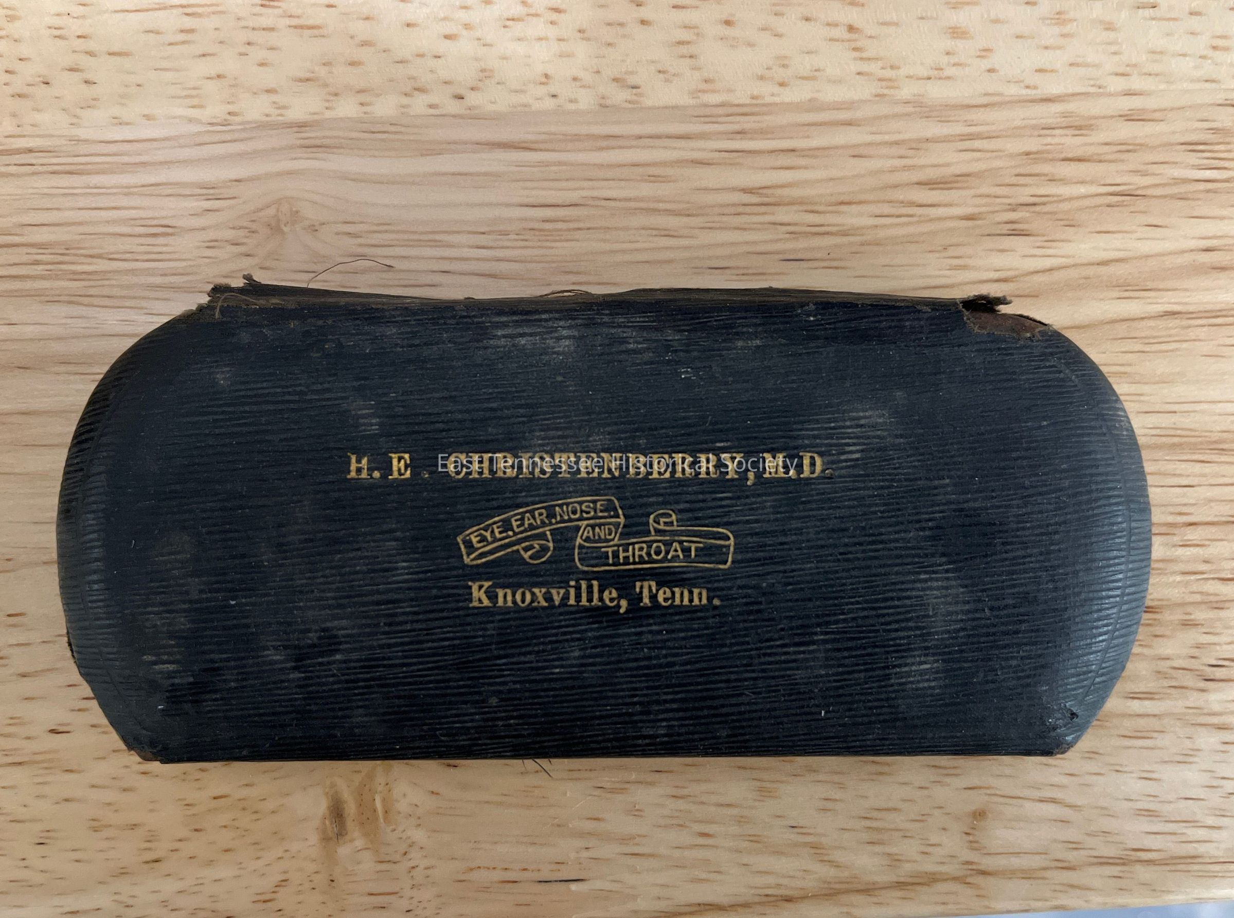 Black textured case with gold writing on the top that says, "H.E. Christenberry, M.D. Eye, Ear, Nose, and Throat Knoxville Tenn." The inside is black and lined in a velvety fabric.Made/Created