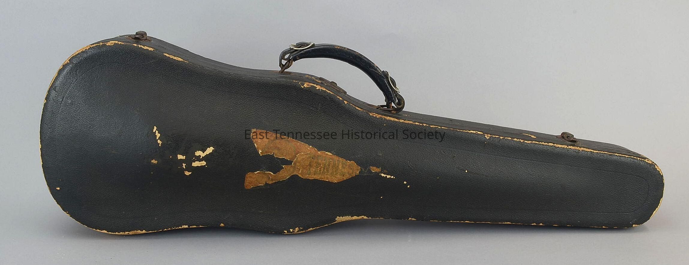 Instrument case believed to be original to fiddle 2012.36.1.1, black pressed fiber board covered with black leather-like paper, three metal hinges on back, two clasps and button lock on front, leather belt-like handle with metal rings over lock, partial decal center on lid top marked "Tennes" [possibly for band The Crazy Tenneseans or University of Tennessee], green felt interior lining/padded bottom, neck rest, boxed area with lid at case end for small items such as strings (dried bits of resin found), felt-covered metal clamps in lid to hold bow, unknown maunufacturer, 9 3/4"h x 30 5/8"w x 3 1/2"d, date unknown*/perhpas 1890-1910.