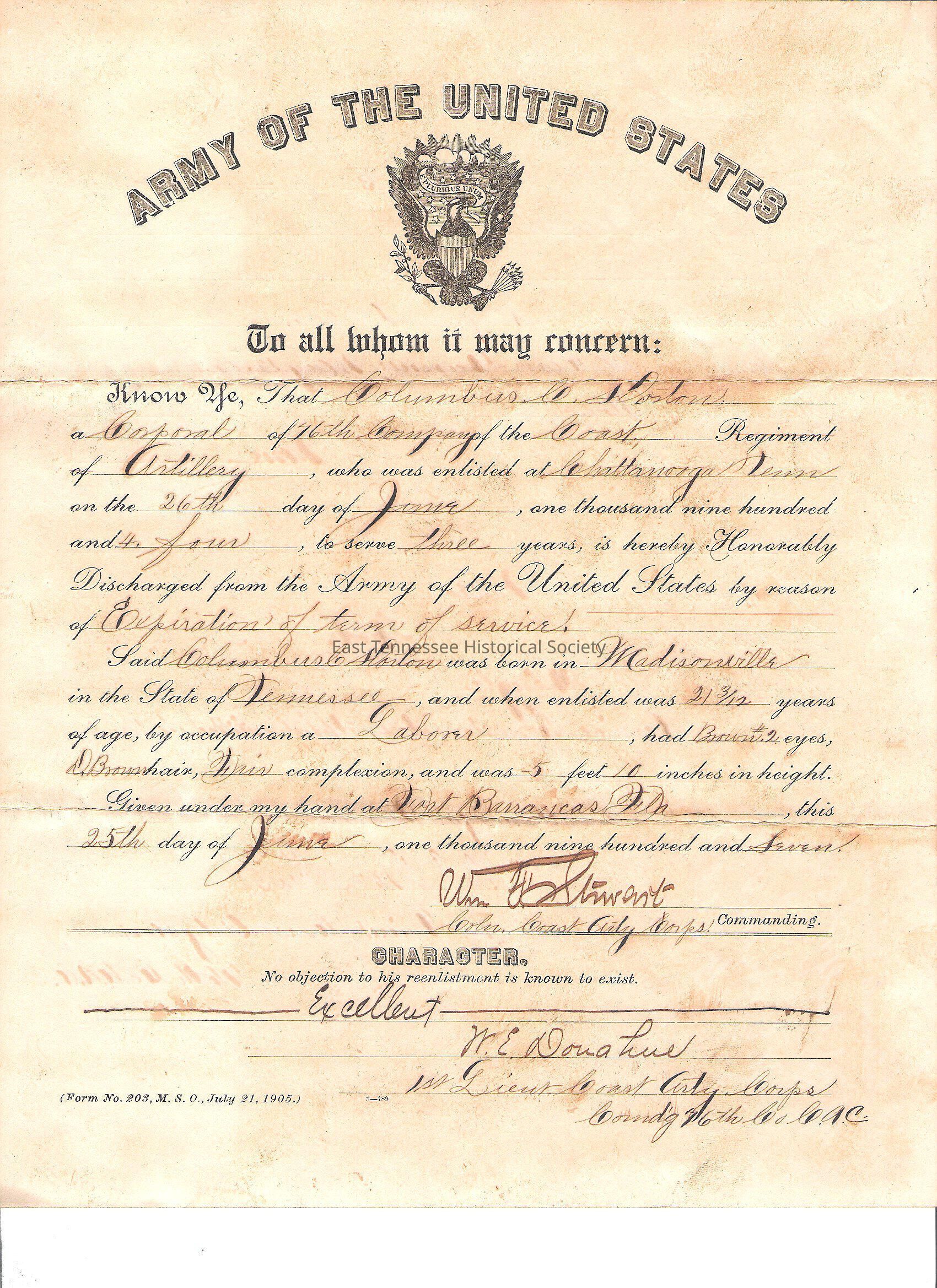 Discharge paperwork from the Army/76th Company of the Coast Artillery for Columbus Cook Horton, June 25, 1907. Notes rank of Corporal (10/2/1906); 1st Class Gunner (5/12/1906).