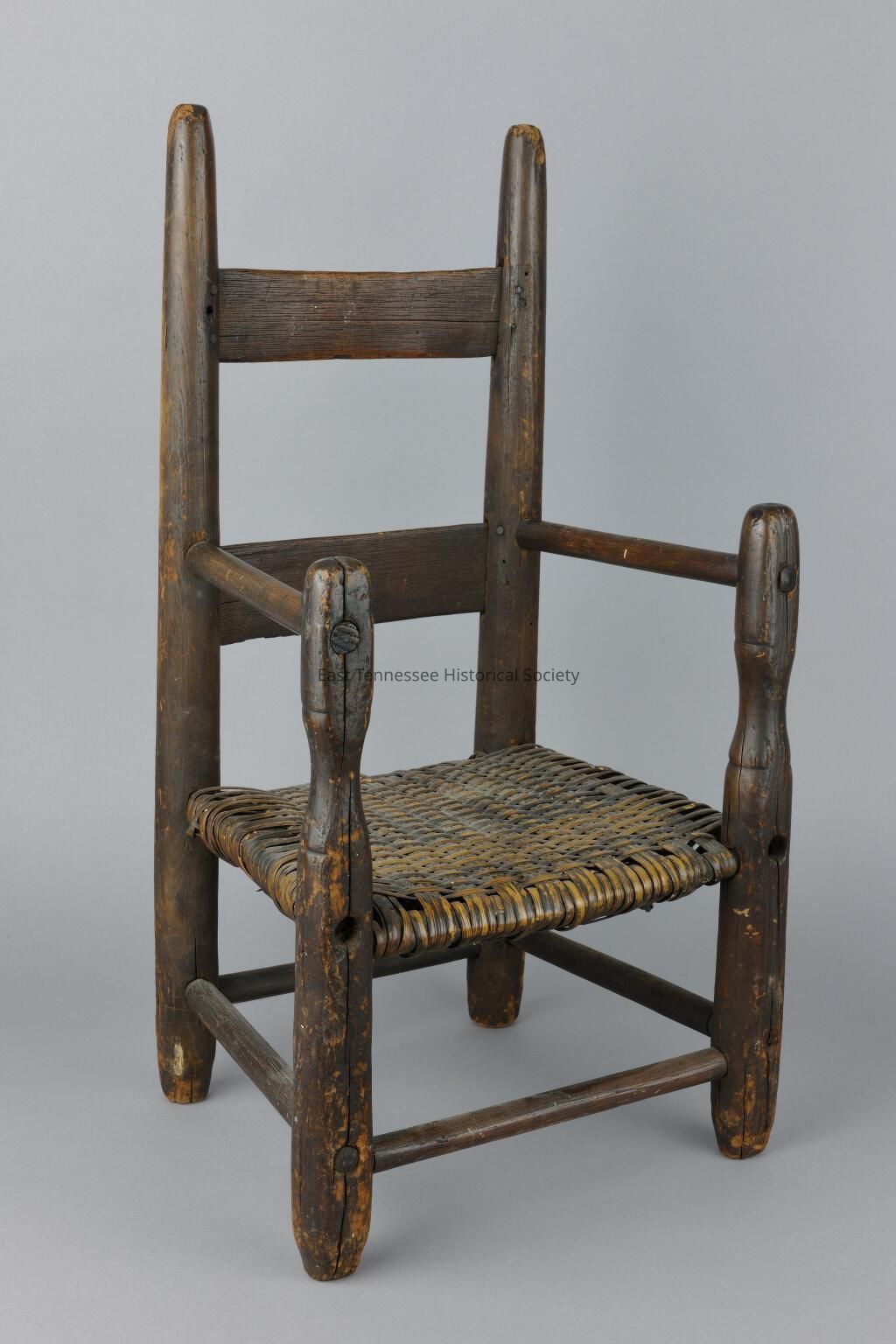 Child's chair from Greene County, wood frame (possibly oak), woven cane seat (which appears original) in one over left-to-right and three under front-to-back pattern, arm rests join below tops of front vertical posts, two slats at back, front legs slightly more intricate than back legs, foot rail all around, unknown maker, 23"h x 12 1/2"w x 10 1/4"d., probably second half of the 19th century/1850-1900.*