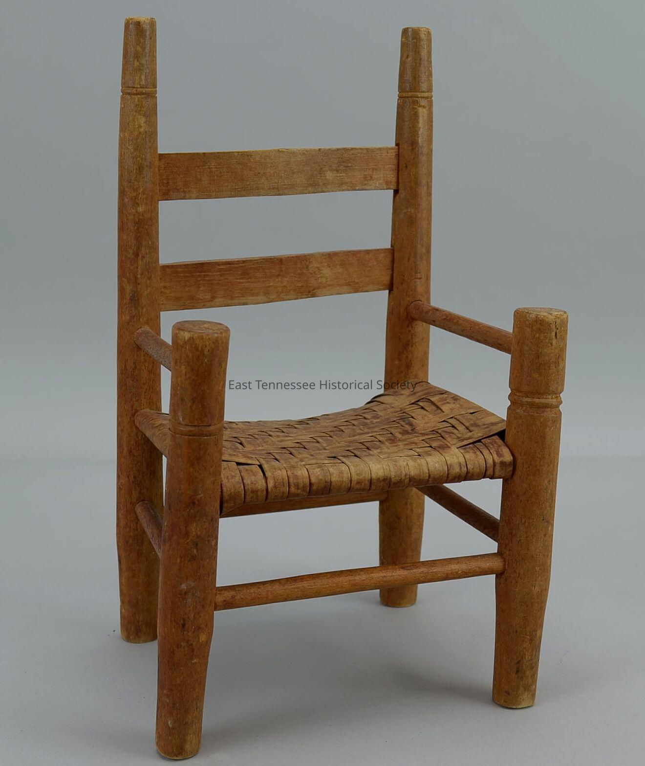 Doll armchair of Nancy Leone Rankin, natural color wood, ladder back, turned trim on tapered back/sides/front legs, herringbone woven slat seat of split wood or bamboo, stretchers between all legs, manufacturer unknown, 13"h x 7 1/2"w x 6 1/2"d, c. 1950s.Made/Created