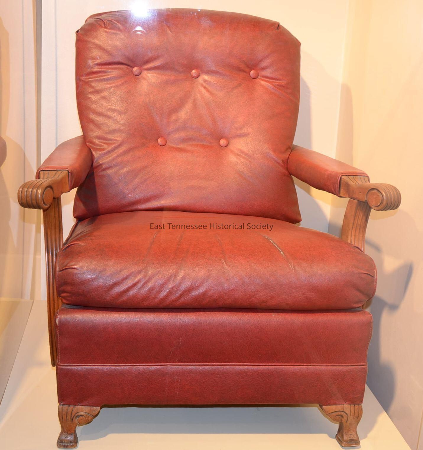 Rocker recliner (chair), reddish-brown leather, five-button backrest in two rows (three buttons on top row and two buttons on bottom), arms covered in leather with wooden ends, wooden handrests have four lines carved into the wood which run vertically, circle carved into wood at arm ends, arms supported by similarly carved wood on either side that runs down side of chair, six legs (two in the front, two in the middle and two in back), utilizes springless all-wood rocker action mechanism, reclines and rocks, manufactured by Berkline Corporation, 35"h x 31 7/8"w x 32"d, 1942.