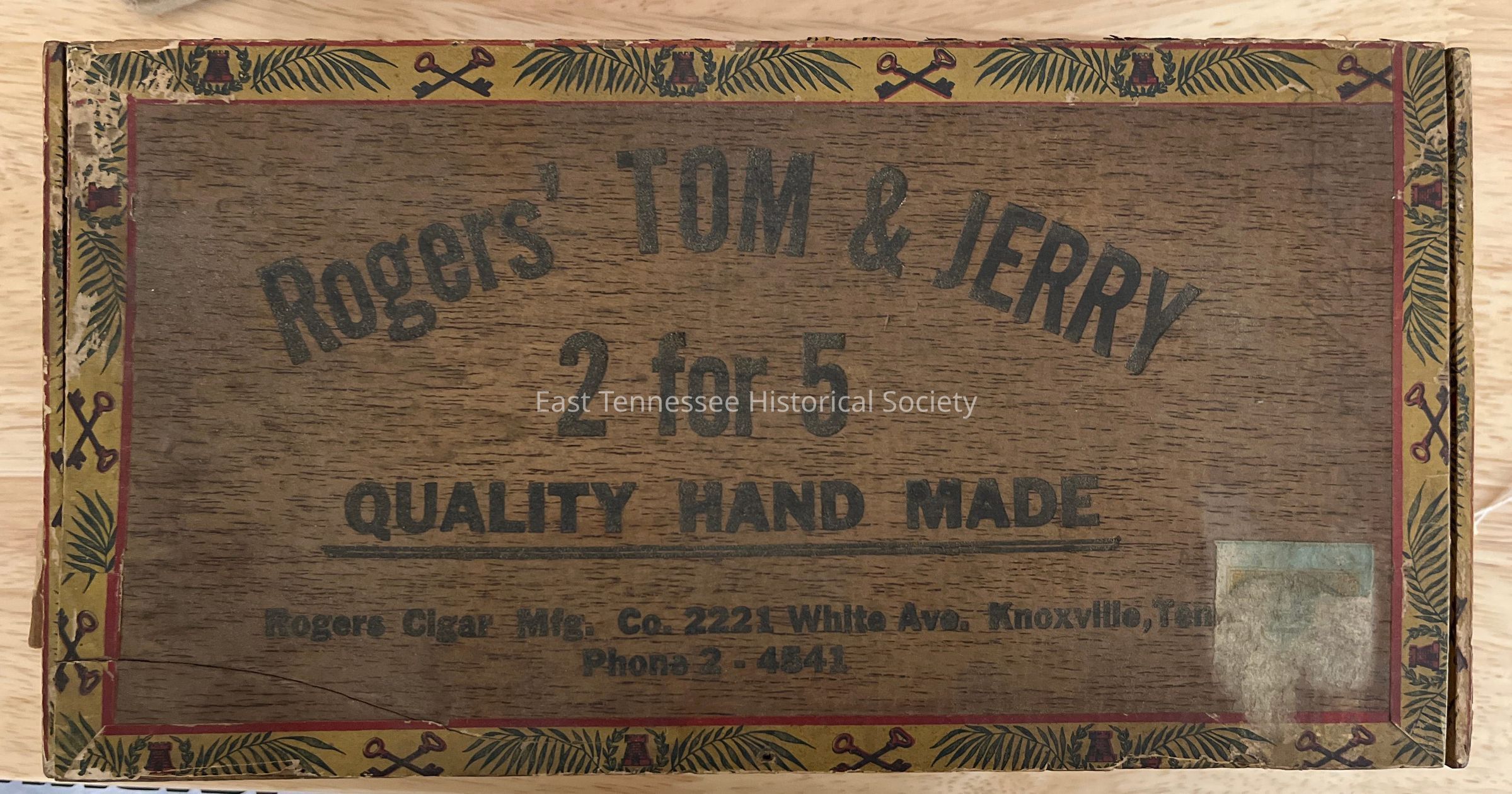 Cigar box with decorative tape on all edges. Top says, "Roger's Tom & Jerry 2 for 5 Quality Handmade Roger's Cigar Mfg. Co. 2221 White Ave, Knoxville, Ten Phone 2-4541". Side says, "2 for 5 c" with a stamp. The other side has a peeling orange sticker. The inside is lined with paper.Dimensions