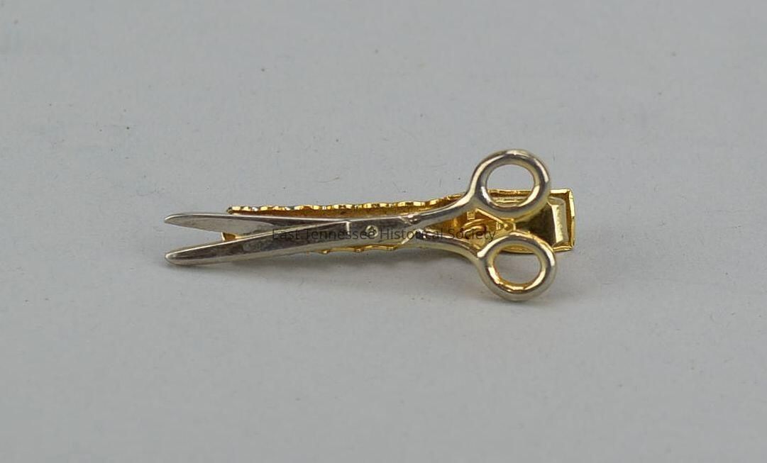 Tie clasp used by David West, gold-color metal, shape of partially open scissors (symbol of Cas Walker's stores, depicts cutting prices), manufacturer unknown, date unknown (1970s?).