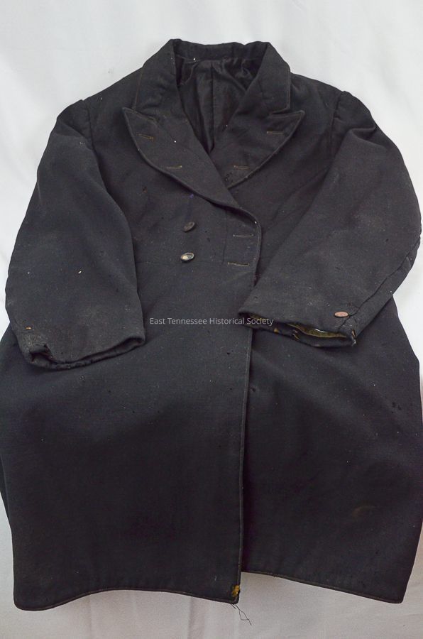 Frock coat (electioneering long coat) of Thomas Rogers Caldwell Campbell, black wool, two buttonholes on each lapel, 1870.