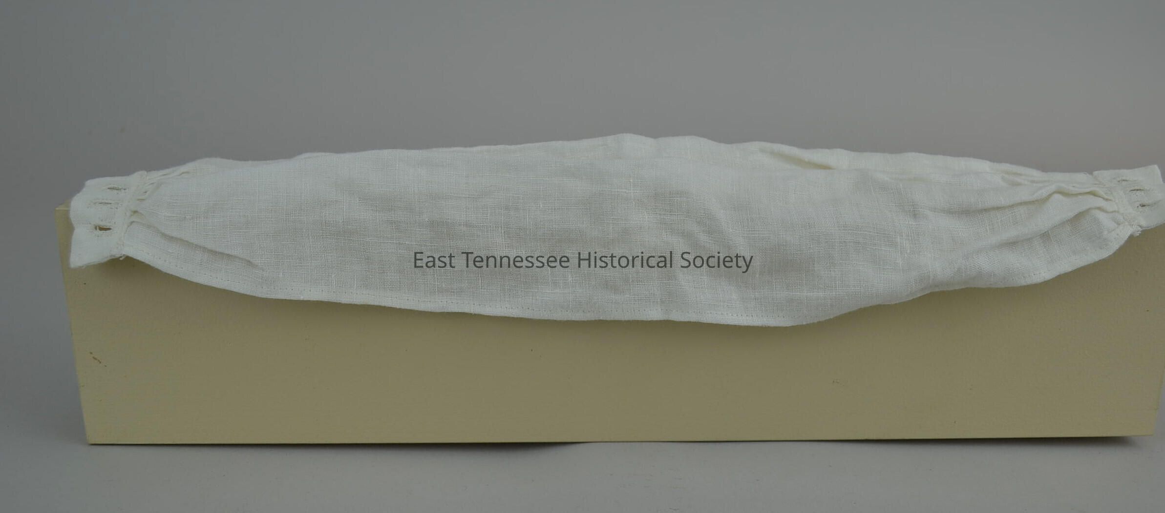 Reproduction French and Indian War-era neck stock used by reenactor Sam Reed, white linen, made by Sam Reed, 6"h x 17 1/2"w, 2006.