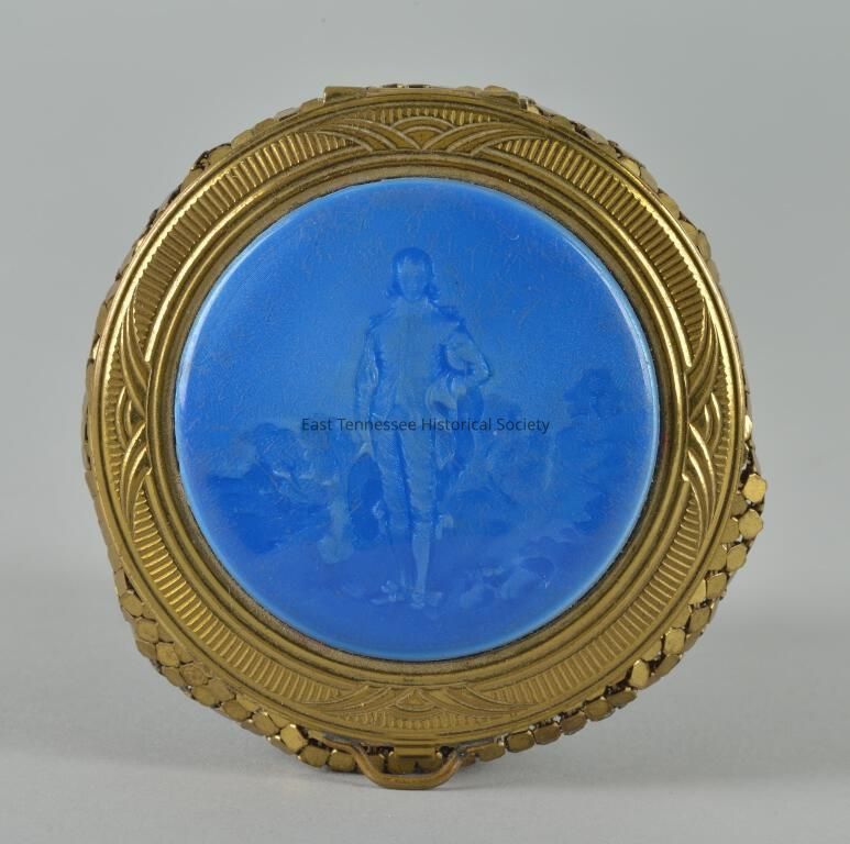 Compact (powder and rouge) of Lena Elliott Lewis, round gold-tone metal with gold-tone mesh bottom, blue-enamel lid with gold-tone decorative frame bears graphic of Rembrandt's "Blue Boy," clasp in front/hinge at back, silver-metal mirror on interior top lid/opens to small puff and rose-color rouge, interior bottom with blue puff and originally white/now pink (from face powder) under-cloth mesh screen, powder traces, manufacturer unknown, 5/8"h x 2 3/4" diam., c. 1940s.Made/Created