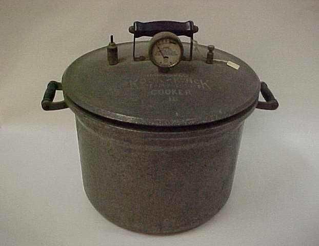 Kook Kwick Cooker home canner, metal w/wooden handles, gauge, 7 quart, 14 1/2"h x 16"w x 13 1/4"d, c. 1930s.Collection