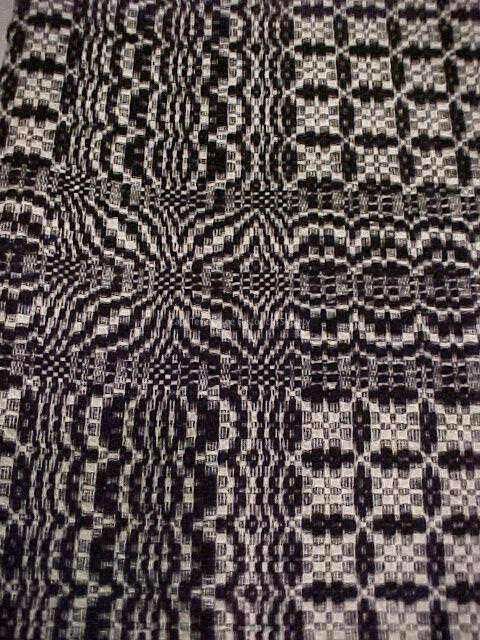 According to Wilson, the coverlet might not have been made in the family. The family might have traded wool for the making of the coverlet. Probably the same weaver who wove #2001.63.19. Similar style, tension, and exactly the same pattern draft. The thread looks to be commerically dyed. She suggested asking Jim Liles to take a look at the threads for estimate of the age of the dyeing.