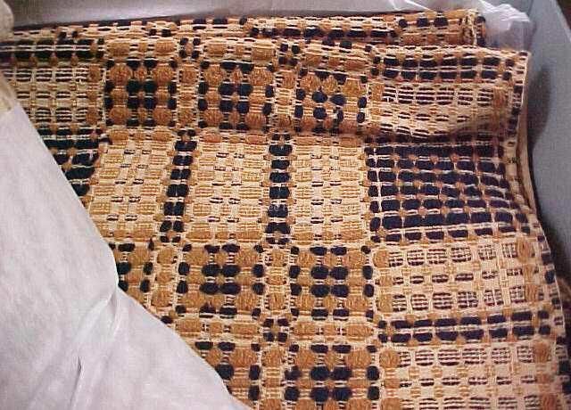 Overshot coverlet, brown and navy wool, comprised of two panels divided into two sections of one panel each: 1) 37"w x 87"l, 2) 37"w x 86"l.
