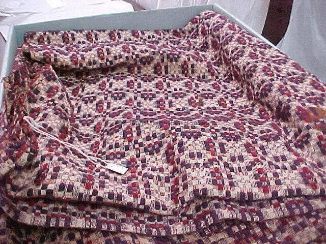 Overshot coverlet, purple (wine) and red wool, comprised of four panels divided into two sections of two panels each: a) 75"w x 86"l (one large stain), b) 72 1/2"w x 83 1/2"l (corner tear).