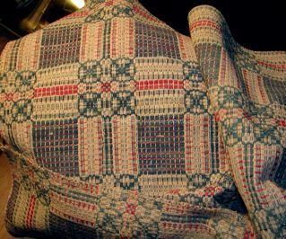 Overshot coverlet from the Fain house 1843*, Double Chariot Wheel pattern, handwoven in two sections of 34"w x 89"l fabric, wools in blue/red/ecru, no care taken to match patterns, heavier weight, includes piece of 1/4" x 1/2" fabric with the initials "MRF" [Margaret Ruth Fain]. Some blue on one end has faded to almost a greenish-blue.