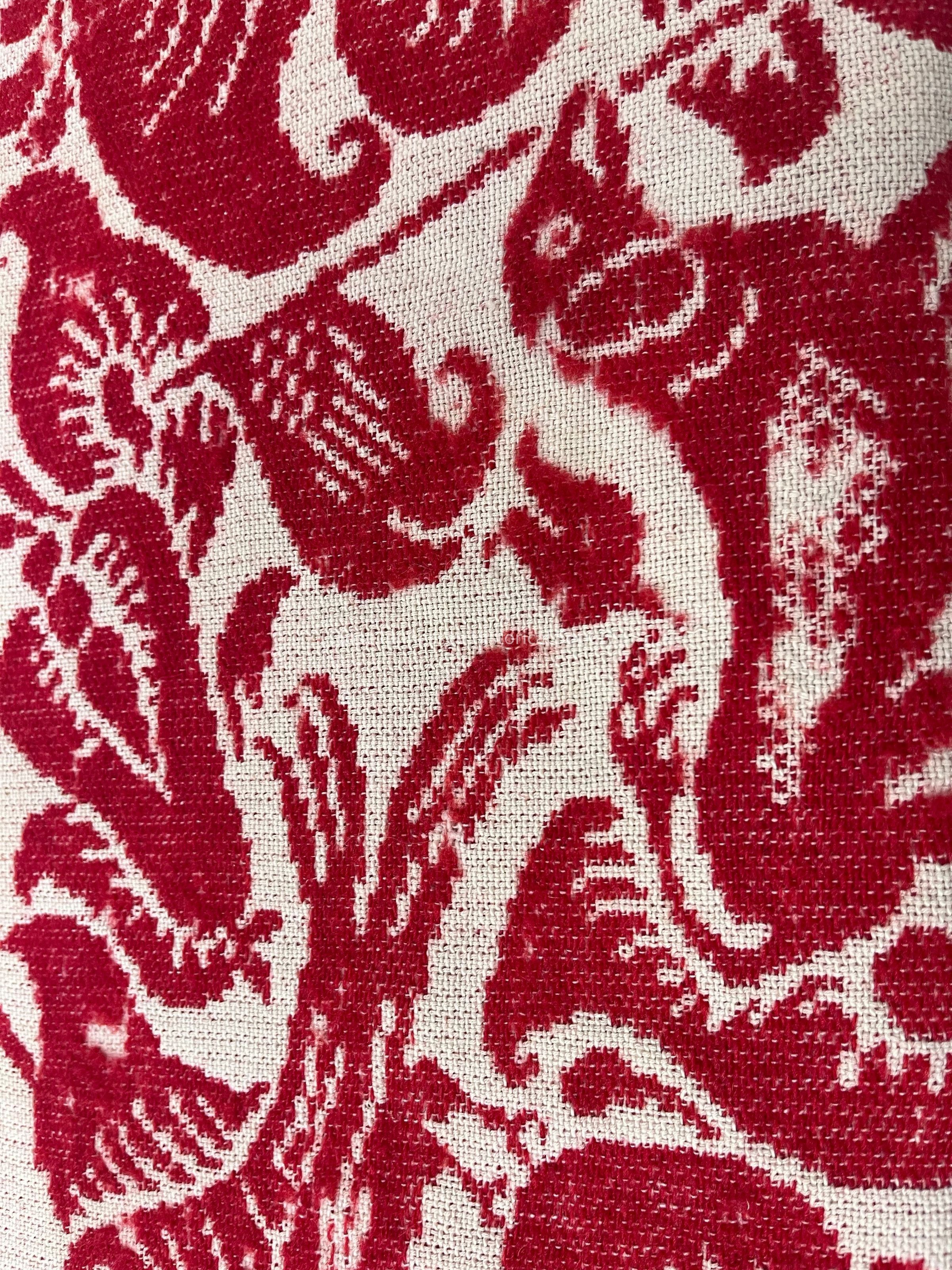 A re and white wool coverlet with two (2) tasseled sides. Corners are inscribed with "M.W.M" and "TENN.". The boarders are decorated with eagles and shields, birds, potted flowers, foliage, and dogs carrying flags. The center contains foliage and wreath decorations.Collection