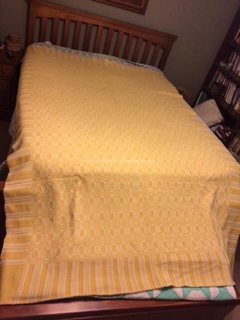 Bedspread loomed, overshot coverlet, by Josephine "Josie" McCarter Watson (1901-1971) in the Whig Rose* pattern with stripe border, double bed size, hand-sewn seam joining two panels, believed to be cotton warp and wool weft, yellow/gold wool weft and white cotton warp. Two panels stitched down the center with pattern matched. "Whig Rose" was a common pattern use dby weavers who sold through "Arrow Craft Shops" run by Pi Phi, date unknown.