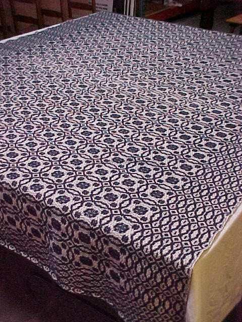 Overshot coverlet made by Lizzie Reagan of Gatlinburg, blue-and-white overlapping-circles design, twin size, sales sticker on back corner marked "$10.00 twin", printed cloth tag at center back marked "ROARING FORK COURT," 63" x 80", prior to 1946.Collection