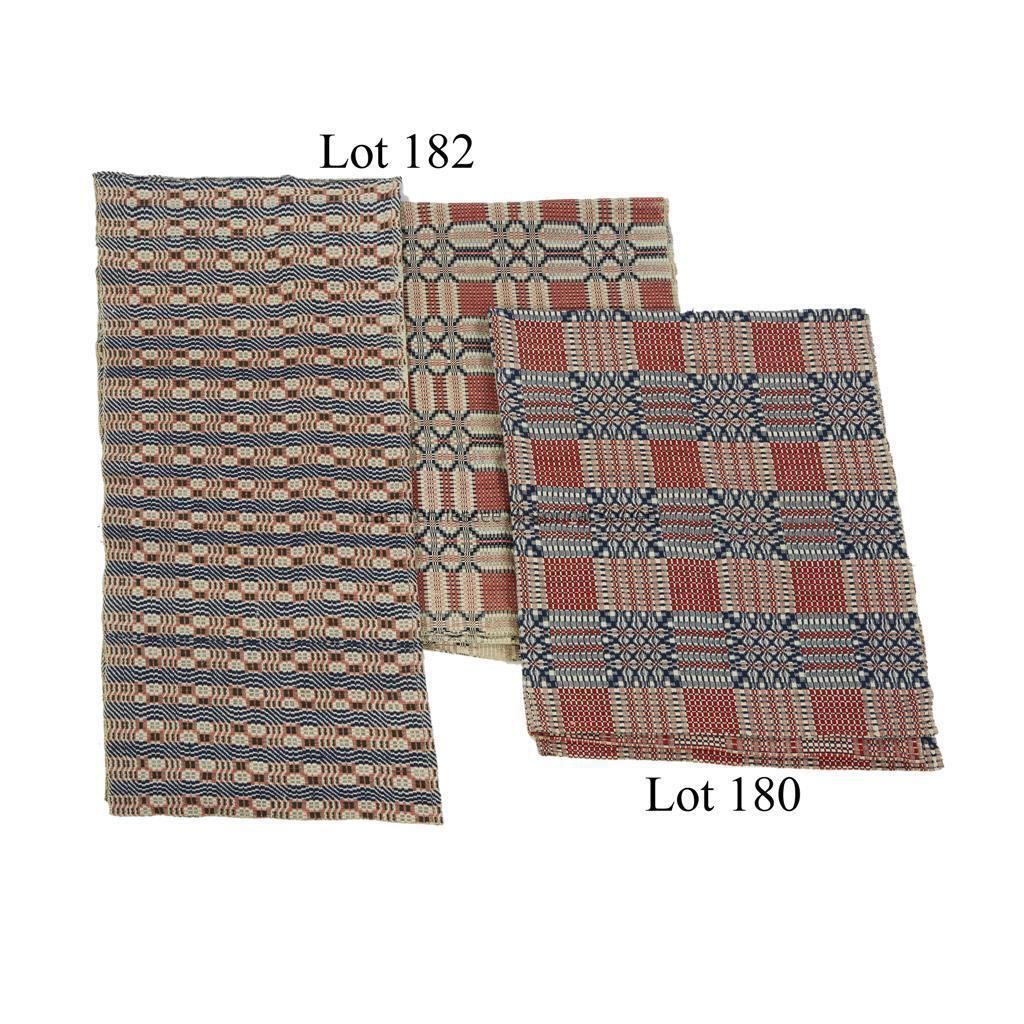 Overshot coverlet attributed to Rachel Blackmore McLin, "Catalpa Flower Variation" pattern in coral red/dark blue/natural, composed of two panels/matched at center seam, 98"h x 72"w, early 19th century.Collection