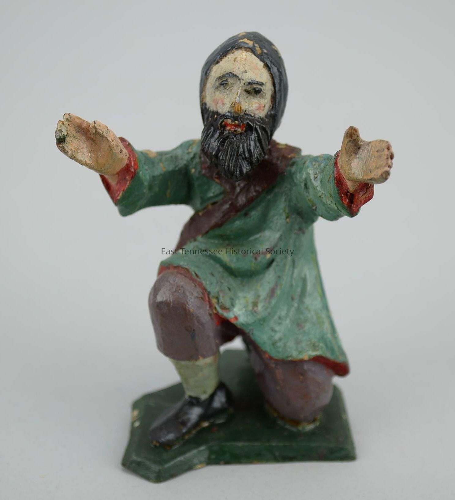 Carved figure of kneeling shepherd, painted wood, both arms raised (as in praise), brown hat with black upturned brim, brown bag over left shoulder, black eyes/eyebrows, red mouth, full black beard, teal tunic with red cuffs and hem, purple breeches, gray stockings, black shoes, made by Fickey family (Germany), 3 5/8"h x 2 3/4"w x 2 1/2"d, 1780-1880.Made/Created