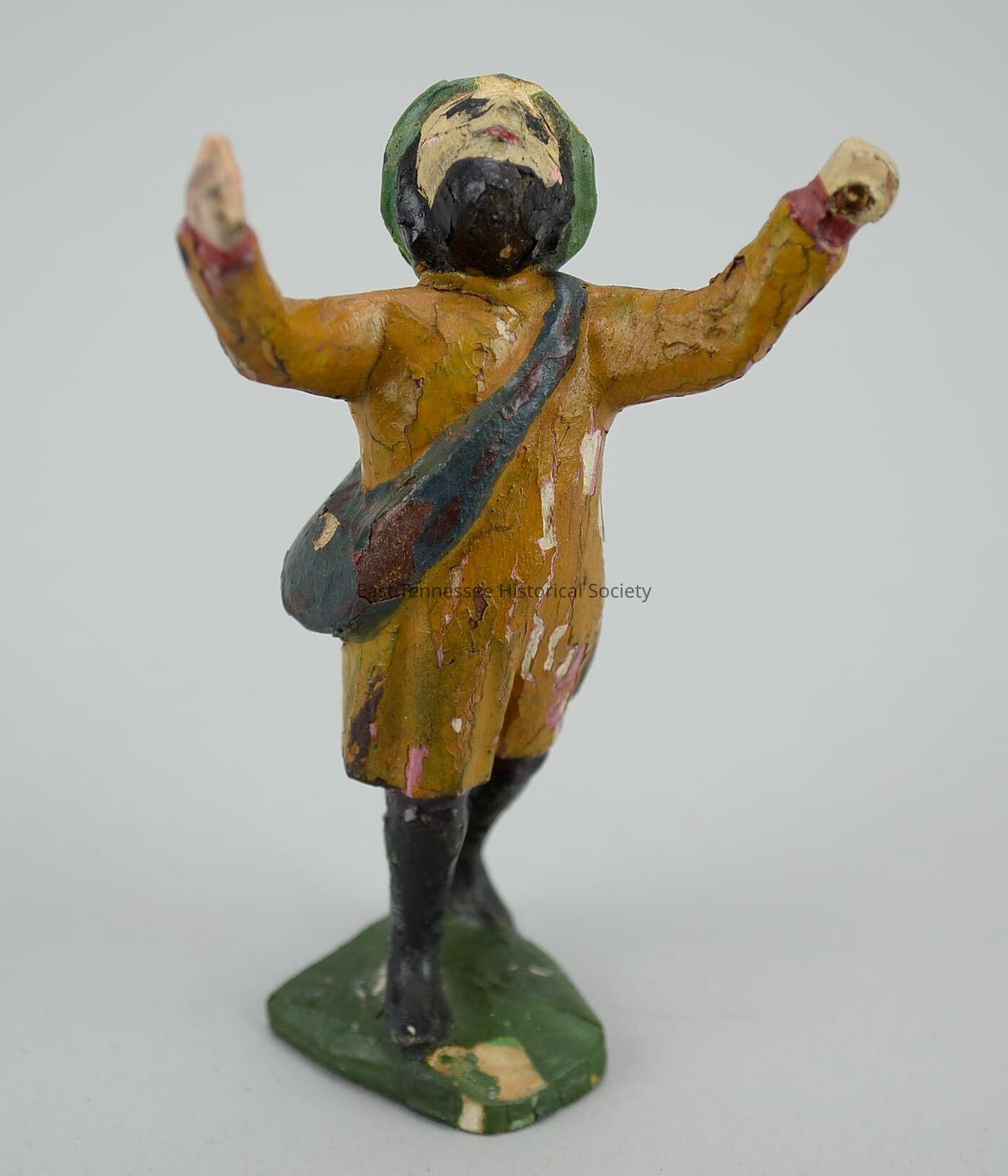 Carved figure of standing shepherd, painted wood, both arms raised (as in praise), bright-green hat with very narrow brim, blue bag over left shoulder, black hair, black Amish-style beard, long mustard-color tunic, tall black boots, green base, made by Fickey family (Germany), 3 13/16"h x 2 7/16"w x 2"d, 1780-1880.Made/Created
